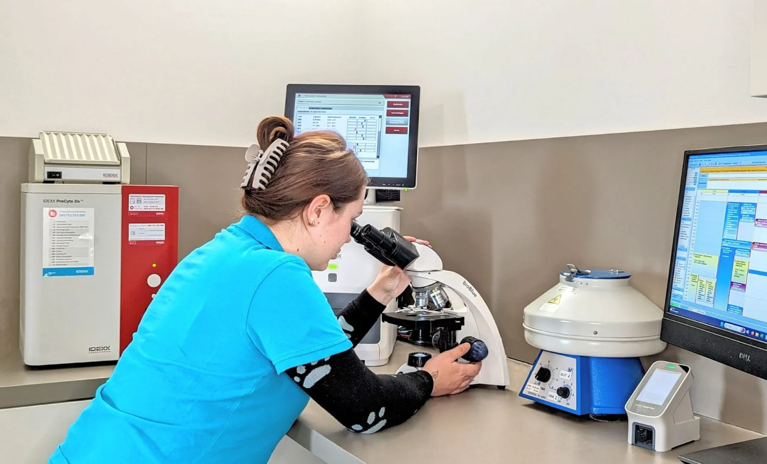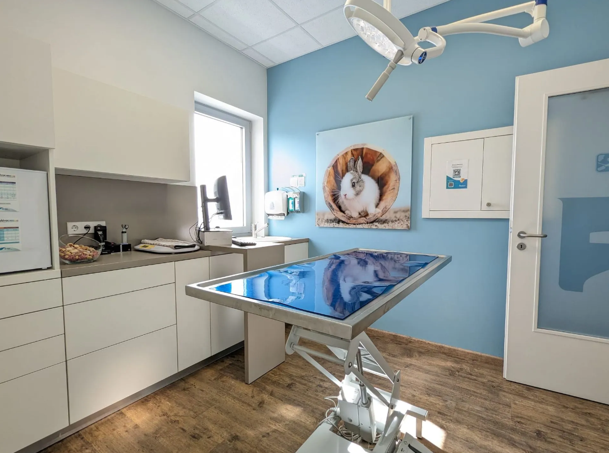 Unsere Patienten und deren Besitzer:innen begrüßen wir in unserem hellen und weiten Empfangs- und Wartebereich. Dort ist genug Platz, damit die Tiere Abstand halten und so Stress und Konflikte vermieden werden können. Unser Wartezimmer verfügt zusätzlich über einen speziellen "Katzenparkplatz", der eine erhöhte geschützte Fläche darstellt. Hier können unsere felinen Patienten entspannt und abseits der anderen Tiere warten. In unseren lichtdurchfluteten Behandlungsräumen haben wir besonders auf eine moderne, aber auch einladende Atmosphäre geachtet, die den Komfort sowohl von unseren Mitarbeiterinnen als auch das Wohlbefinden der Tiere optimal unterstützt. Unsere höhenverstellbaren Untersuchungstische sind nur einer von vielen Benefits. In unserem hauseigenen Labor führen wir Blut-, Kot- und Urinuntersuchungen sowie die Analyse zytologischer Präparate direkt vor Ort durch.